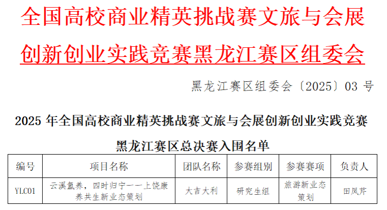 近日,全国高校商业精英挑战赛文旅与会展创新创业实践竞赛黑龙江赛区正式公布获奖结果。东北农业大学经济管理学院专业学位教育中心研究生团队(成员:田凤芹、焦铃雁、纪学文、王亚宁;指导教师:李炜)凭借作品《云溪氲养,四时归宁——上饶康养共生新业态策划》(作品代码:YLC01),在全省35所院校、712支参赛队伍中脱颖而出,荣获黑龙江省研究生组文化旅游赛道三等奖。